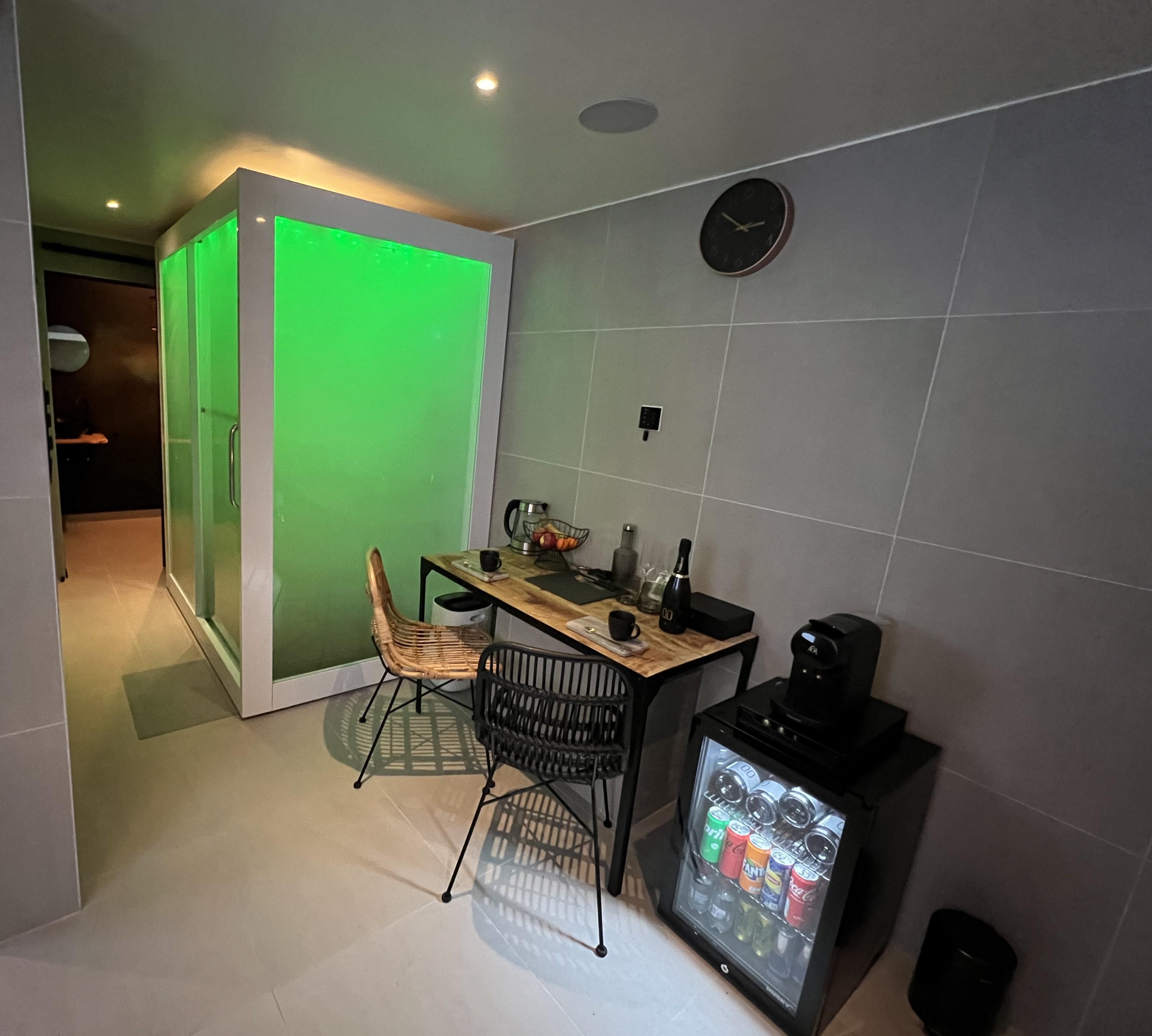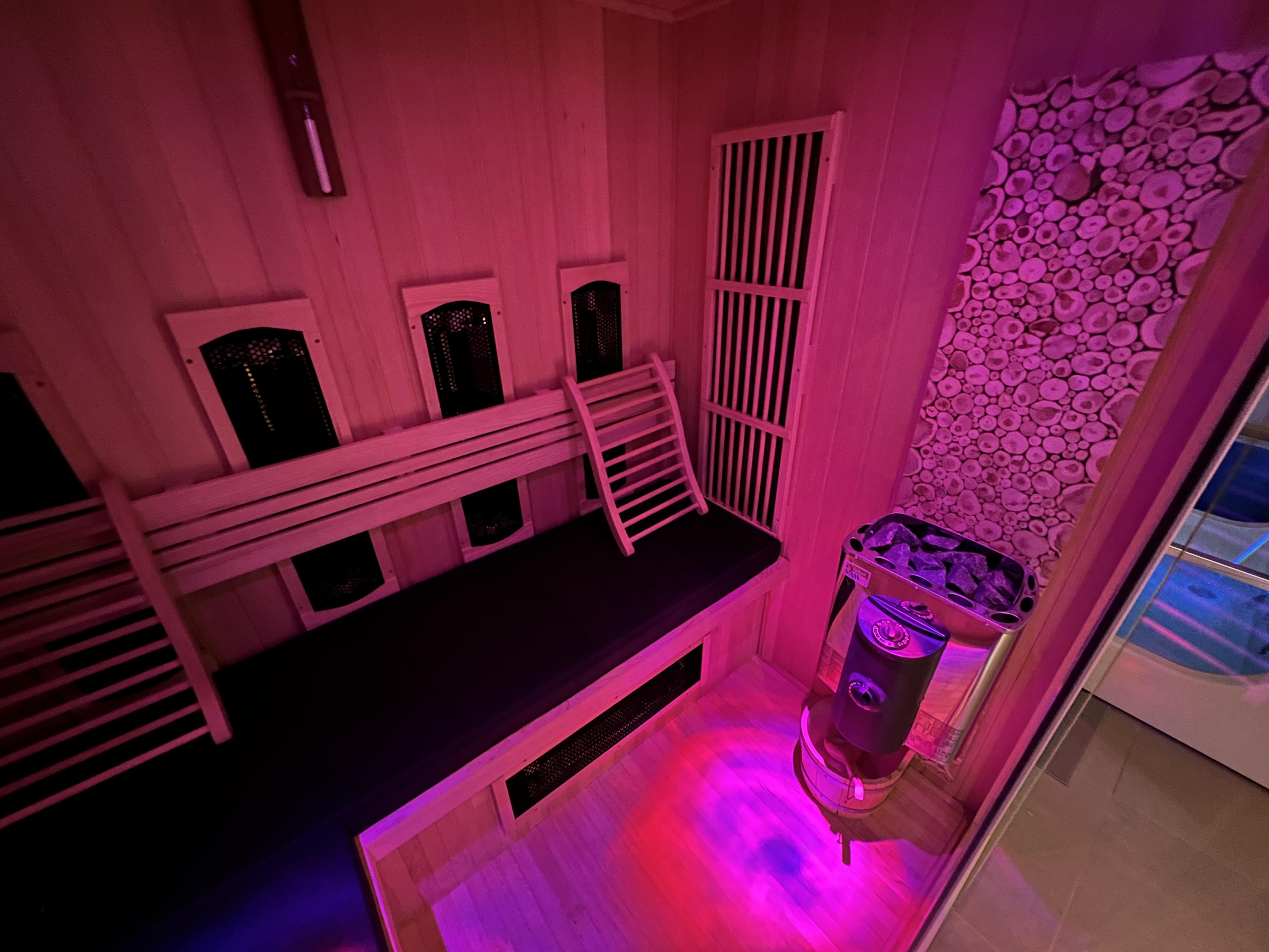 Voor wie van sauna's houdt, is er een combi sauna met zowel infrarood als een traditionele kachel. Hier kun je genieten van de helende warmte en ontgiften.
