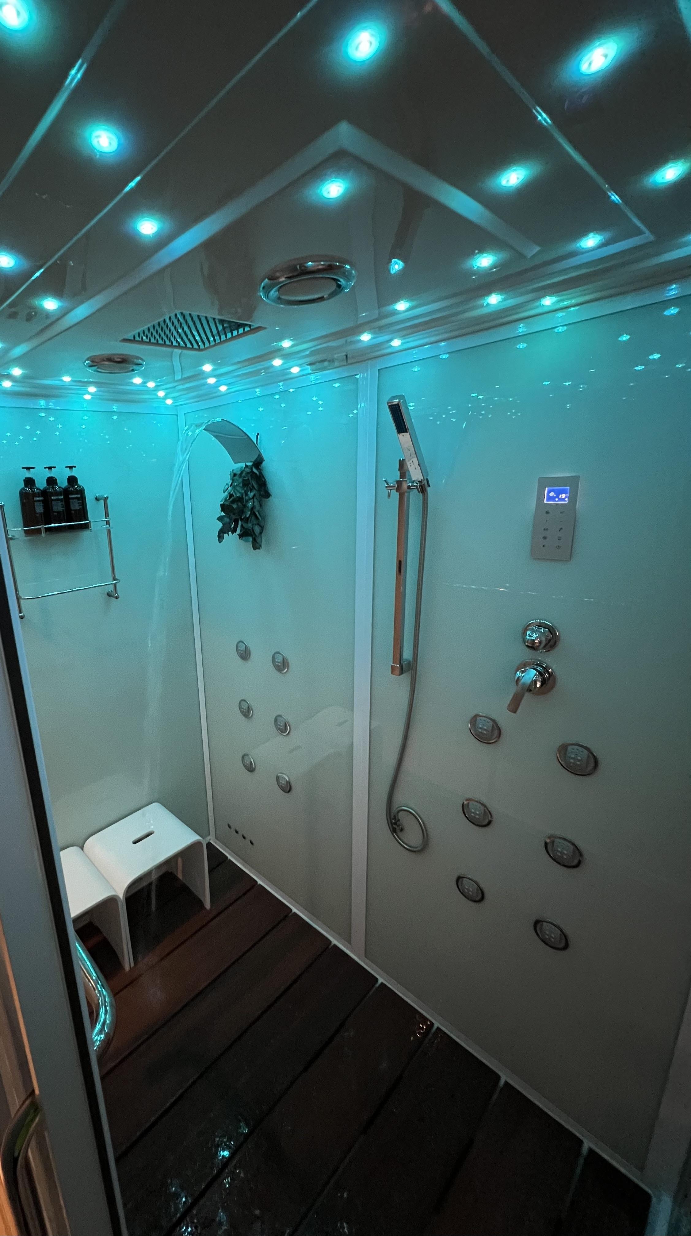 Stap binnen en laat de stress van de dag achter je. Neem plaats in het bubbelbad en voel de warme waterstralen je spieren ontspannen. Of geniet van de verkwikkende stoom in de stoomcabine, die je huid reinigt en je geest tot rust brengt.
